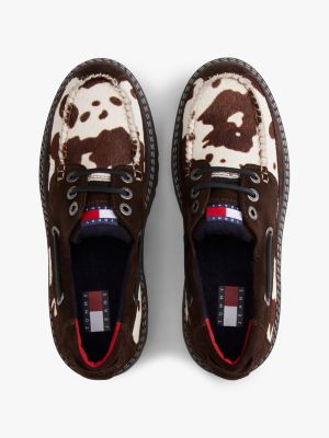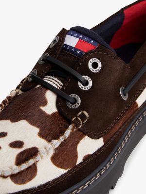 Step into these cleated boat shoes, crafted from suede and featuring a striking cow print in calf hair across the upper.