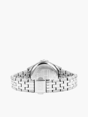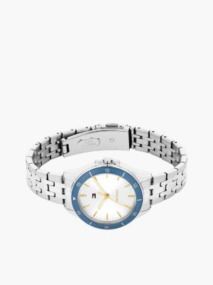 The contrasting blue bezel adds nautical spirit to this chain-link watch, while the brushed dial delivers a touch of texture.