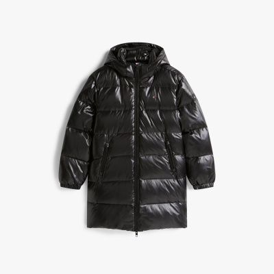 This shiny puffer jacket features a warm down filling and comes in a stylish longer length to protect against the elements.