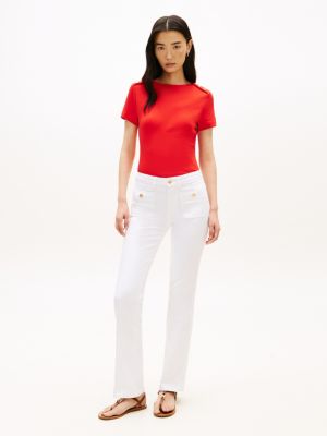 This silky slim-fitting T-shirt with a boat neck and gold-tone shoulder buttons brings a touch of glamour to casual dressing.