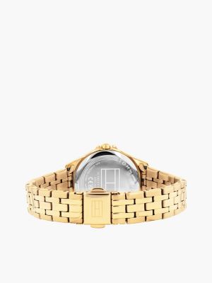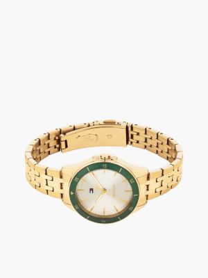 Opt for timeless elegance with this watch, featuring a sleek chain-link strap complemented by a green bezel surrounding a champagne-coloured dial.