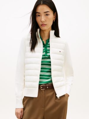 This stylish, lightweight jacket combines a padded design with subtly contrasting knitted sleeves and a ribbed funnel neck for added warmth.