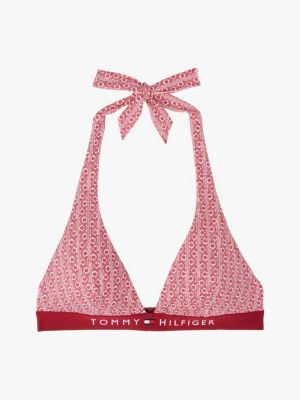 Embrace a nostalgic poolside look with this self-tie halterneck bikini top that features a vibrant all-over print and removable padding.