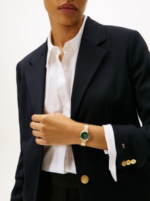 This luxurious gold-tone watch features an eye-catching green dial in a contemporary oval shape and a jewellery-style mesh bracelet strap.