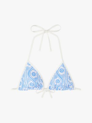 Add eye-catching design detail to your beach look with this print bikini top, designed in a classic triangle shape with self-tie straps.