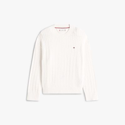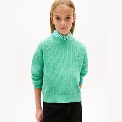 This pure cotton jumper is knitted with a pointelle texture and classic cable pattern, making it a cosy choice for unseasonal days.