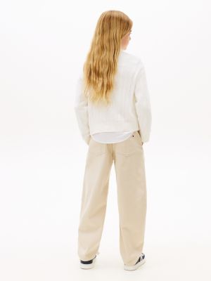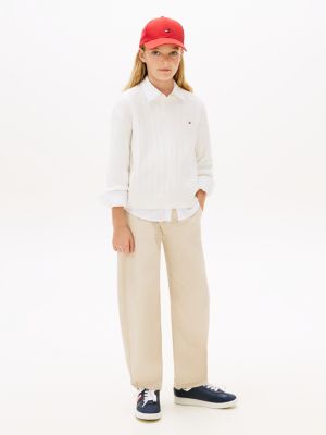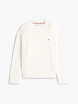 This pure cotton jumper is knitted with a pointelle texture and classic cable pattern, making it a cosy choice for unseasonal days.