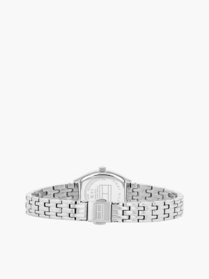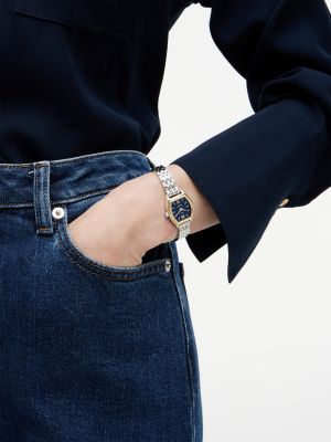 This stainless steel chain-link watch with gold-plated detail and a blue sunray dial is a sophisticated accessory for any occasion.