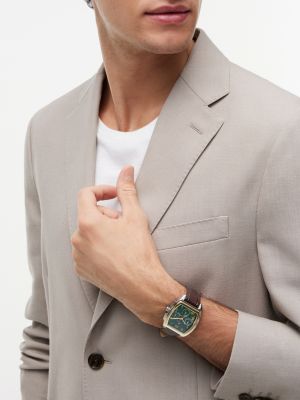 Enjoy a modern classic with this chronograph watch, featuring a premium leather strap, a gold-plated square case and a trio of sub-counters.