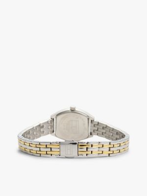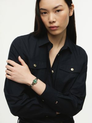 This classic watch draws the eye with its gleaming two-tone strap, enhanced by a square dial in a rich shade of green.