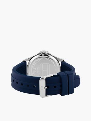 Complete your smart outfits with this stainless steel watch, featuring a blue silicone strap and red detailing on the dial.