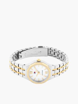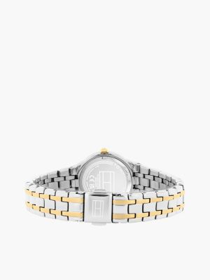 This luxurious watch shimmers with its frosted sunray dial, while the two-tone combination of gold-plating and stainless steel enhances the eye-catching look.